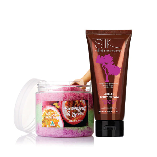 Treat yourself to a burst of fruity freshness and skin-loving hydration with the Passionfruit & Lychee Indulgence Duo. This vibrant self-care set is designed to relax your body and awaken your senses with its exotic, sweet aroma.