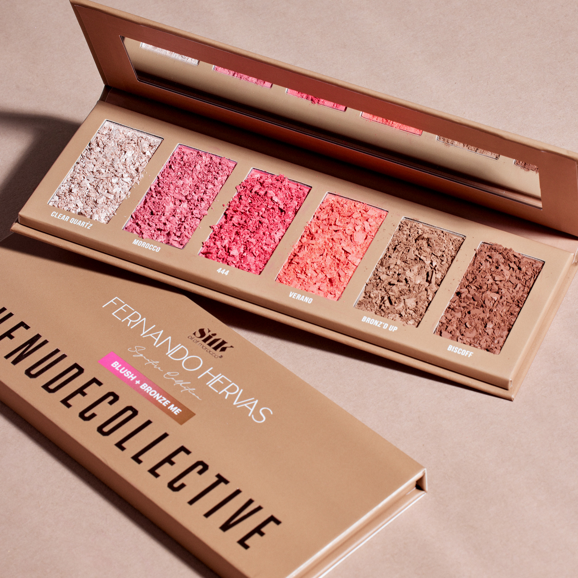 Discover the ultimate in beauty versatility with our expertly curated Blush + Bronze Me combination palette. This luxurious pressed powder formula, crafted alongside Celebrity Make-up Artist Fernando Hervas, offers a seamless application for a flawless finish. The palette has it all... featuring an exquisite selection of both pink and peach-toned blushers, luminous highlighters, as well as contour and bronzing shades!